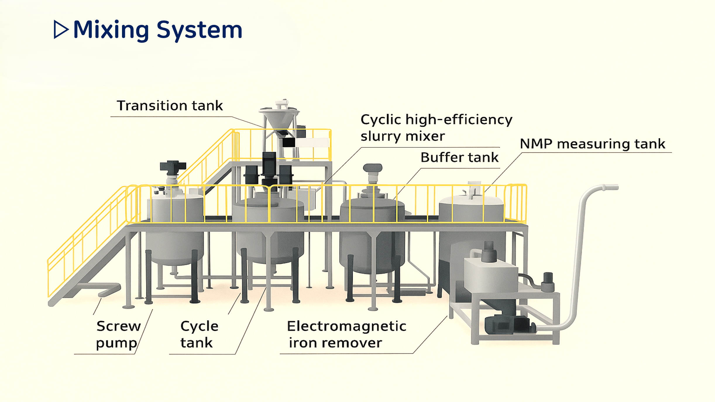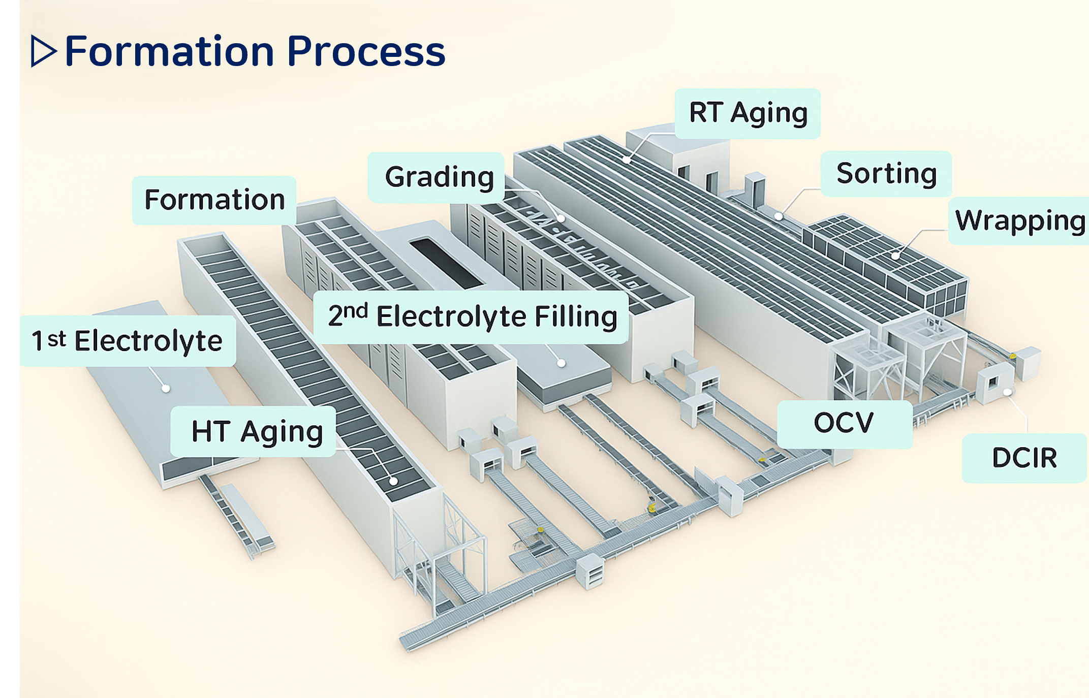믹싱부터 전극, 조립, 화성, 유틸리티 공정에 이르기까지 2차전지 제조의 전 과정에 걸쳐 필요한 모든 설비와 시스템을 완벽하게 통합하고 전체 생산 라인의 단계별 공정을 개별 관리할 필요 없이 단일 창구를 통해 원스톱으로 진행합니다 또한, 시간과 비용을 절감하고 최종적인 품질과 생산성을 극대화하여 공정 간 연계성과 효율적인 운영이 가능합니다